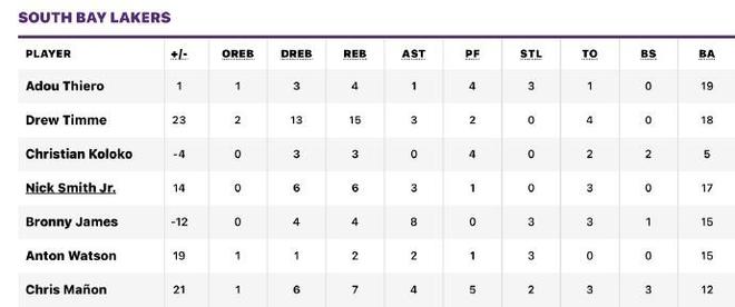 如今湖人没有伤员,球队排兵布阵的人员太多,因而下放布朗尼与蒂耶罗到发展联盟。布朗尼与蒂耶罗率领南湾湖人115-95大胜圣克鲁兹勇士,首节南湾湖人28-20领先,第二节28-30被追回2分,上半场维持56-50领先优势。