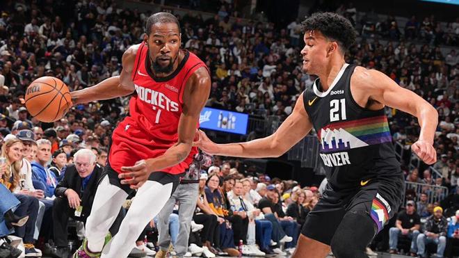 这套单侧边线启动、吸注意找弱侧套路一开,掘金夹击轮转都慢一拍了。虽然今天杜兰特有精彩的半场破领防游动中投,但火箭今天的传球真开了。
