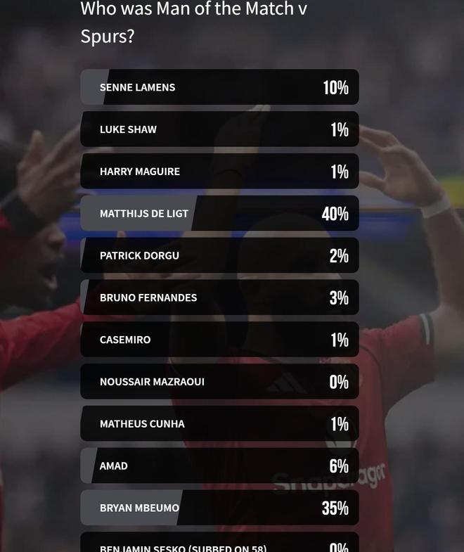 赛后,德利赫特获得了40%球迷的投票,当选队内最佳,为球队进球的姆伯莫获得了35%的投票,另外,门将拉门斯也获得了10%的票数。