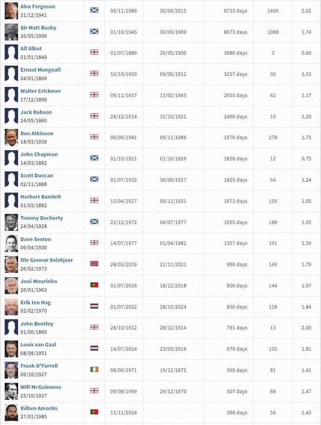 执教曼联满一年的教练单一任期排行:弗格森居首,阿莫林列第二十位
