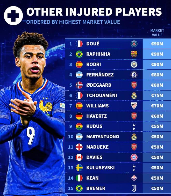 亚马尔(西班牙/巴塞罗那)2亿欧元、登贝莱(法国/巴黎圣日耳曼)1亿欧元、穆西亚拉(德国/拜仁慕尼黑)1.4亿欧元