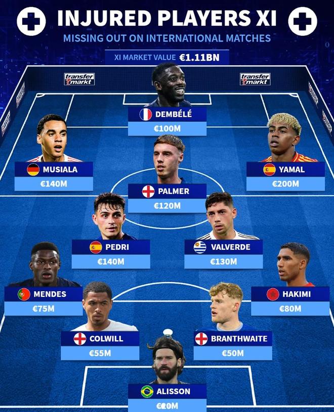 北京时间11月15日,德转统计出了因伤缺席本月国际比赛日的最贵11人阵容,亚马尔、登贝莱领衔,穆西亚拉、帕尔默、佩德里、巴尔韦德在列。