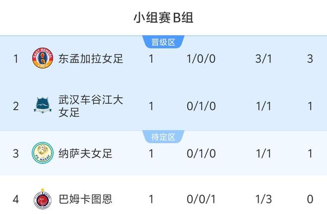 小组另外一场比赛中,东孟加拉女足客场3-1击败巴姆卡图恩。小组排名方面,东孟加拉女足积3分排在小组第1,武汉女足与纳萨夫女足同积1分位列第2和第3,巴姆卡图恩垫底。