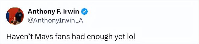 看着独行侠两位旧将同时当选周最佳,名记Irwin调侃独行侠球迷应该受够了。